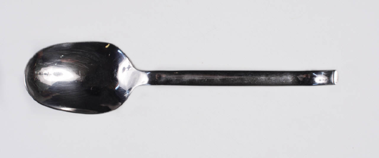 Cucchiaio in acciaio, liscio: ampia conca ovale, lungo manico a bacchetta, a sezione ovale con la parte terminale volta all'insù