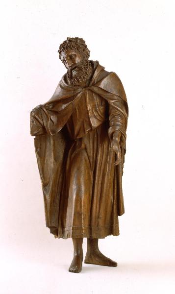 Scultura a tutto tondo senza tracce di policromia raffigurante Nicodemo. Il personaggio è colto in piedi, lievemente piegato verso sinistra, con il capo e lo sguardo rivolti nella medesima direzione, porta il braccio destro (mutilo) aperto e il sinistro verso il basso; i piedi, con il destro più avanzato, suggeriscono l'impressione del movimento. La superficie non presenta tracce di preparazione gessosa, né policromia, né doratura.