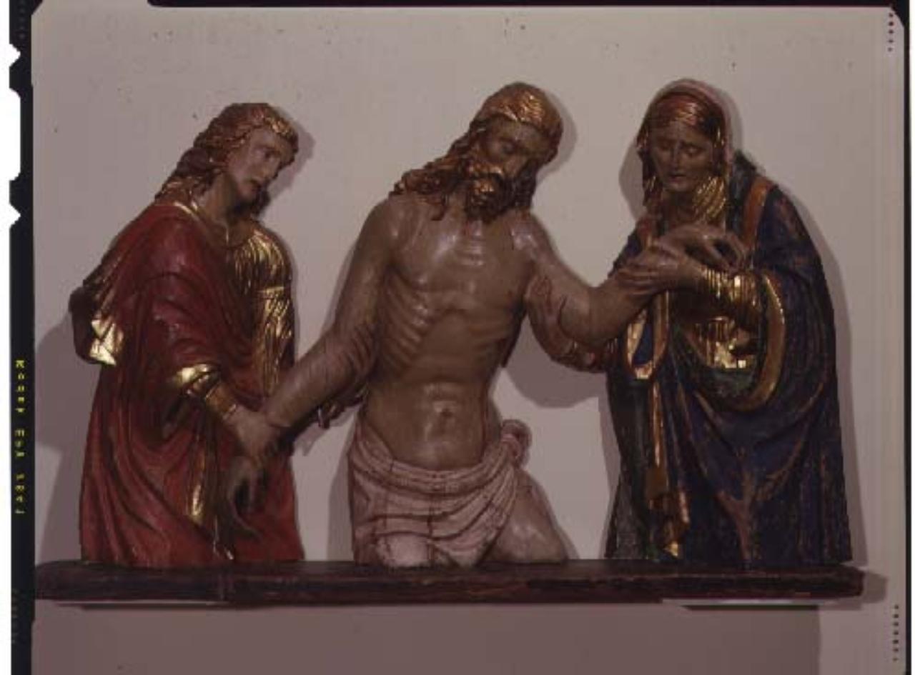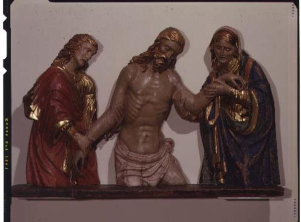 Rilievo raffigurante la Pietà costituito da tre figure: San Giovanni Evangelista, Gesù e Maria, tagliate all'altezza delle ginocchia e appoggiate su una mensola sottile.