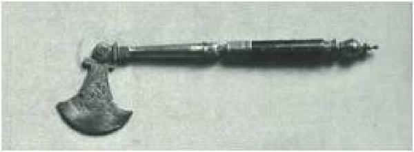 Piccola ascia girante intorno ad un perno per scuoiare. Manico il legno, con pomolo e applicazioni in metallo a girali incise su fondo dorato.