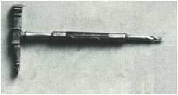 Martelletto terminante con succhiello. Manico il legno con applicazioni in metallo a girali incise su fondo dorato.