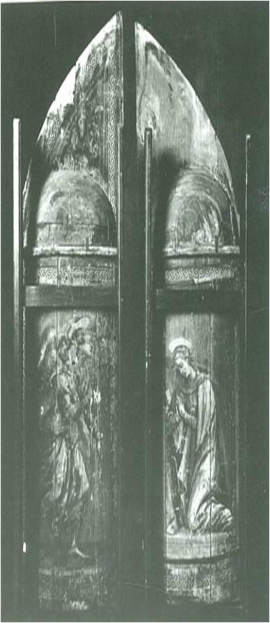 Sportello destro cuspidato, pendant di Inv. Sculture Lignee n. 52, formante un arco a sesto acuto e racchiudente una nicchia con statua di Apostolo: San Giovanni Evangelista (?) e nella parte superiore un clipeo dipinto con la figura dell'arcangelo Gabriele, raffigurato a figura intera anche sul verso dello sportello.
