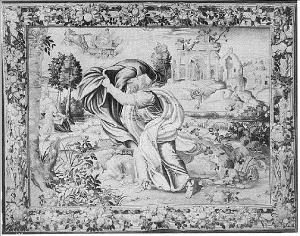 - NOTIZIE STORICO CRITICHE L'arazzo è un perfetto esempio delle caratteristiche figurative di questa serie di Elia ed Eliseo: composizione incentrata su pochi personaggi; la figura di Eliseo ha una posa di disorganico dinamismo; minuziosa descrizione naturalistica; superficiale patina classicistica (emergere dell'architettura, rovina dell'arco trionfale, che può leggersi simbolicamente come un'allegoria della fine del paganesimo).
