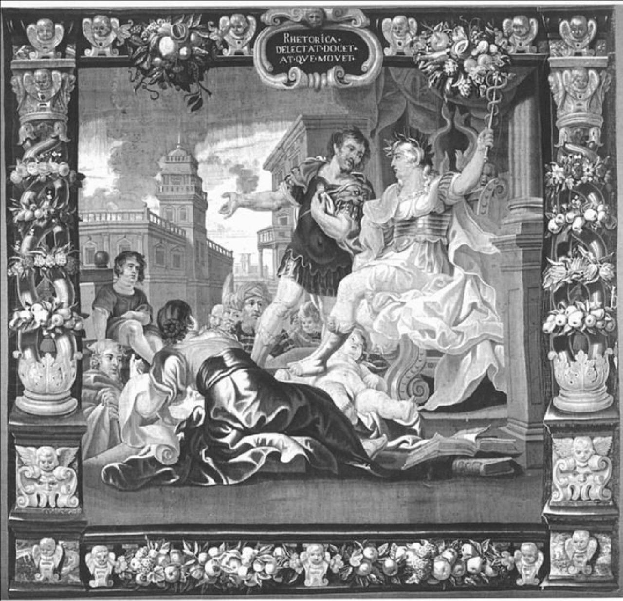 Serie di arazzi rappresentano le cinque arti liberali. Il sesto arazzo raffigura l'intero gruppo delle Sette Arti Liberali. In tutti e sei i pezzi ricorrono le medesime cornici: ai due lati vi sono due colonne con basi e capitelli dorati; il fusto è formato da tre tubi metallici di colore verde intrecciati tra di loro e allacciati da corone di fiori (anemoni, rose, garofani, e tulipani) e frutti. Le basi e i capitelli delle colonne sono decorati con teste di angioletti alati. Nel bordo inferiore invece tre teste di angioletti chiudono, alle estremità e al centro, due festoni di foglie e frutti. Nel lato superiore vi sono due testine di angelo e un festone che fiancheggiano il fastigio centrale che presenta le didascalia relativa alla scena raffigurata in ciascun arazzo.