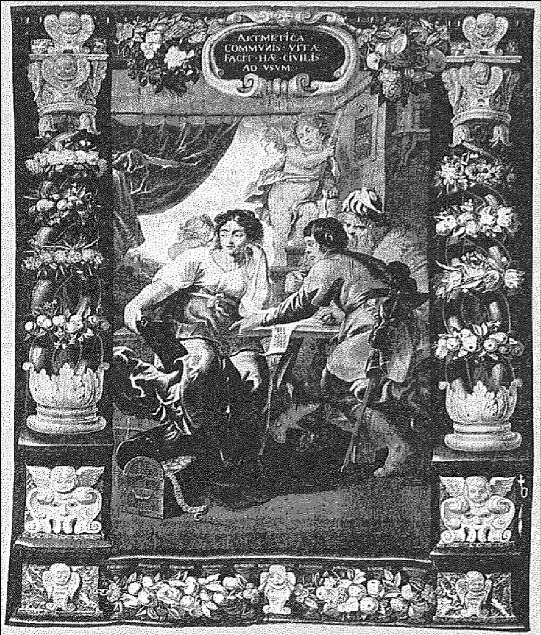 - NOTIZIE STORICO CRITICHE La scena dell'aritmetica (che riprende l'immagine che Ripa ne dà nell'Iconologia), si conforma alla tradizionale iconografica: in quanto arte utile alla vita civile, sopratutto in ambito finanziario, viene rappresentata immersa in una scena incentrata sul conto del danaro. \nL'immagine è una copia in controparte dell'omonima incisione di Cornelius Shut con alcune modifiche come ad esempio la presenza di tre puttini e la loro differente collocazione all'interno della scena. Sono note sei repliche dello stesso cartone.