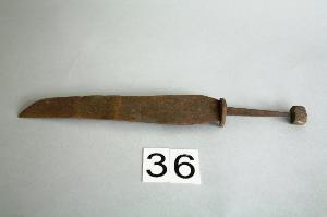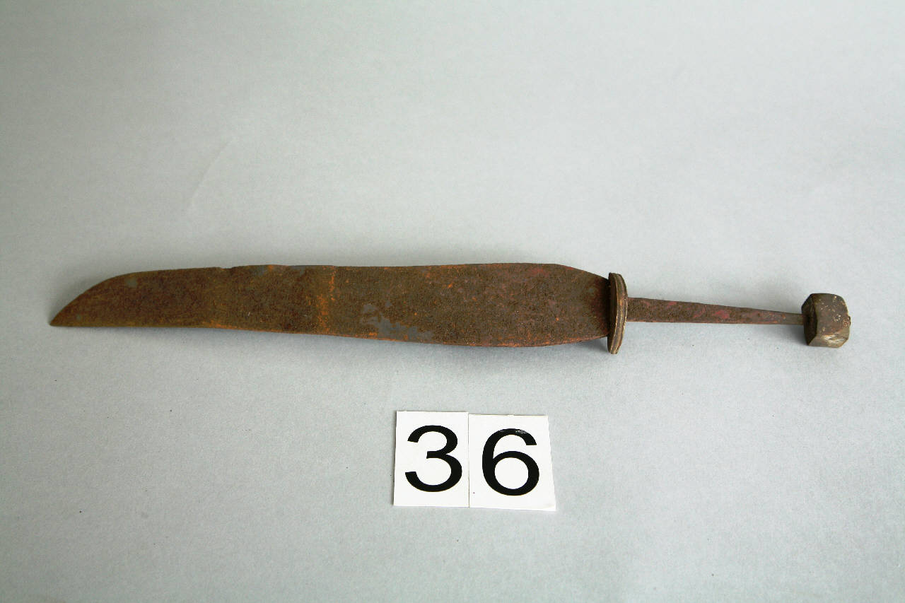 Lama, con sezione a cuneo, leggermente espansa al tallone, che prosegue rastremandosi con filo leggermente concavo e dorso sonvesso. Lungo codolo di sezione rettangolare e, incastrati su di esso, un piccola elsa a semicerchio e un pomo a forma di parallelepipedo in lega.