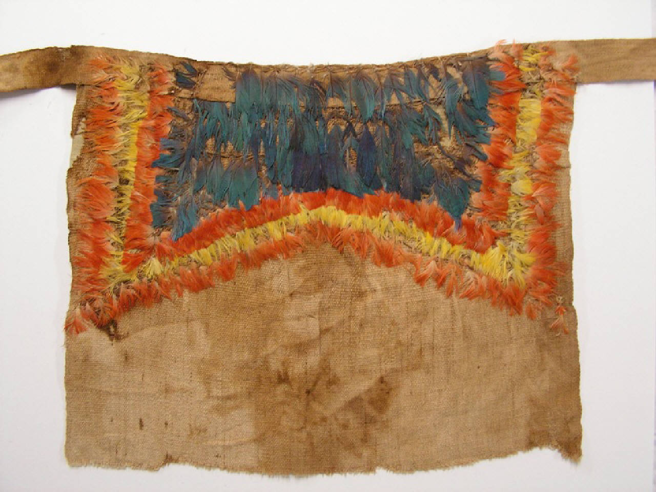 - NOTIZIE STORICO CRITICHE Analizzato da Ann Rowe durante la sua visita a dicembre del 2013. Il tessuto è probabilmente chimu ma la forma del perizoma ricorda quelli chancay. La fascia, simile al 1497, è più grezza del tessuto ed è un'altra lavorazione. Forse tutti gli elementi sono antichi, ma non è detto che l'assemblaggio sia originale. Il sistema di aggancio delle piume è compatibile con quelli antichi.