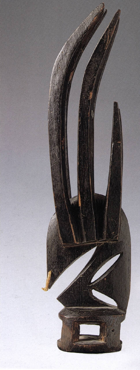 In loco la scultura lignea era agganciata a una calottina legata alla testa e al costume del danzatore. Il corpo dell'antilope è reso con volumi geometrici essenziali che si compongono un gioco di vuoti e di pieni. L'enfasi cade sulla verticalità con lunghe orecchie e corna che si proiettano verso l'alto.