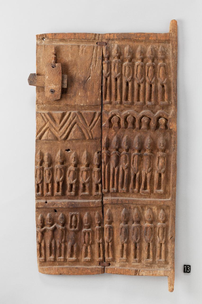 Porta di granaio a due pannelli rettangolari, uniti da graffe di ferro. Sulla superficie dei pannelli sono intagliate figure antropomorfe di cui quattro portano una maschera kanaga. La stessa maschera è rappresentata sull'altro pannello accanto alla serratura.