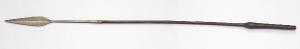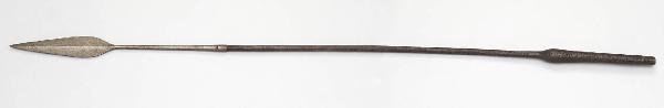 Lancia con gorbia troncoconica aperta con all'opposto un foro attraversato da un giunto metallico ribattuto; lungo collo che termina in una cuspide a foglia crestata. Asta in legno scurito, decorata a righi che si intrecciano, con rigonfiamento verso il fondo per bilanciare l'asta.