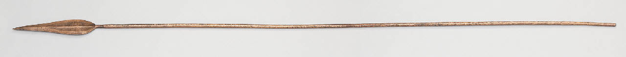 Lancia rituale costituita di un'unica parte di rame, con un lungo stelo che termina in una cuspide a foglia allungata, con nervatura centrale delimitata da depressioni laterali dal fondo graffiato.
