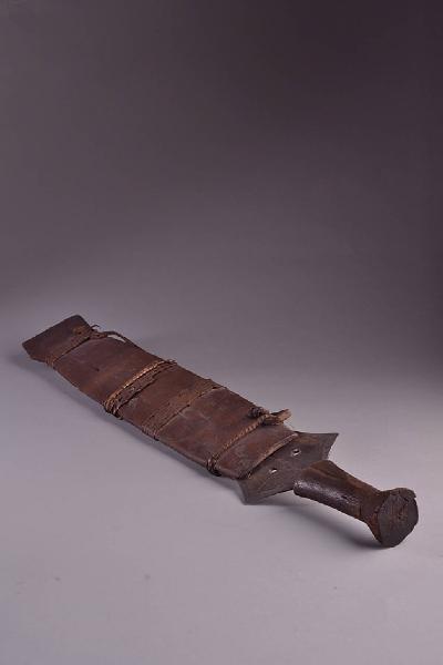 Daga congolese con impugnatura in legno poroso di sezione circolare con un'alta strozzatura che separa il breve pomo conico dal resto dell'impugnatura troncoconica, caratterizzata da una scanalatura mediana in prossimità della lama. Lama espansa al tallone con bordi brevi e concavi, che forma due alette nel forte, stringendosi verso il medio, con i due fili che seguono un andamento concavo e curvano a metà del medio per proseguire convessi nel debole, congiungendosi a punta acuta. Tutta la lama, su entrambi i piani, è incisa a fitti segmenti zigzaganti su tutto il lato sinistro, delimitato da una scanalatura centrale e da un'altra che segue il filo. In corrispondenza delle due alette ci sono due fori dal bordo zigrinato, e un altro fra il medio e il debole, delimita la fine della scanalatura centrale, oltre la quale la decorazione cambia in martellata. Fodero rettangolare in legno costituita di due parti incollate (ora staccate), con tre fasce di vimini intrecciati che le tengono unite, avvolgendole, nelle quali passa un cordino di pelle per legare l'arma al fianco.