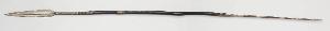 Ferro con gorbia troncoconica aperta e cuspide a foglia. Su entrambi i piani di lama, cresta centrale delimitata alla sinistra da sguscio e leggera depressione in corrispondenza del filo alla destra. Asta in legno nero, nodoso, che si storta a tre quarti, con due avvolgimenti di piattina di ferro in senso destrorso; lungo puntale in ferro, squadrato e rastremato in punta, assicurato all'asta da un chiodo.
