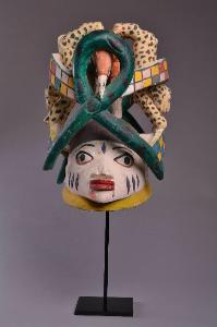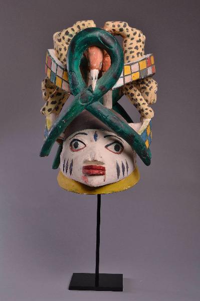MASCHERA. Sono intagliati, tra l'altro, due leopardi, un serpente, un uccello; la maschera è policroma.