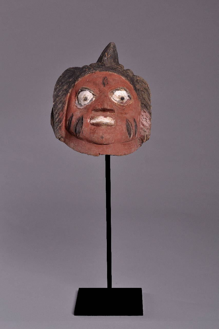 MASCHERA. E' intagliata una testa con un'elaborata acconciatura femminile; la maschera è sui toni del marrone con occhi e bocca bianchi.
