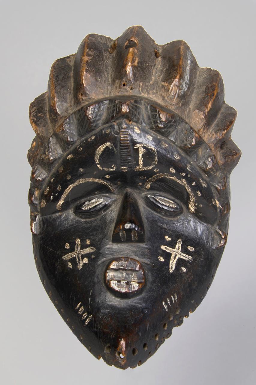 MASCHERA GELA (GEH-NAW) - Il volto antropomorfo ha forma concava che vista di profilo ha la forma di un quarto di luna. I due piani su cui è giocato il viso sono articolati a livello degli occhi, costituiti da una fessura e leggeremente obliqui. Il naso è a base triangolare, il mento appuntito. L'acconciatura è composta da treccine. La bocca è costituita da un cilindro sporgente con denti in vista. La maschera è tinta in nero con segni bianchi a indicare sopracciglia e tatuaggi o scarificazioni. Lungo il profilo, fori per attaccare la maschera al costume.