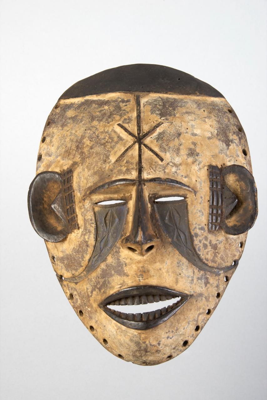 MASCHERA AGBOGHO MMWO - Maschera facciale antropomorfa con volto tinto bianco (caolino) attraversato da una linea verticale che dall'attaccatura dei capelli scende lungo la fronte e si prolunga al setto nasale. Sulla fronte un motivo cruciforme in rilievo; occhi forati a fessura da cui si dipartono due motivi curvilinei incisi che si assottigliano in direzione delle estremità laterali del viso. Motivi lineari in rilievo in prossimità delle orecchie: bocca aperta con denti in mostra. Lungo il profilo della maschera fori per l'attaccatura del costume.