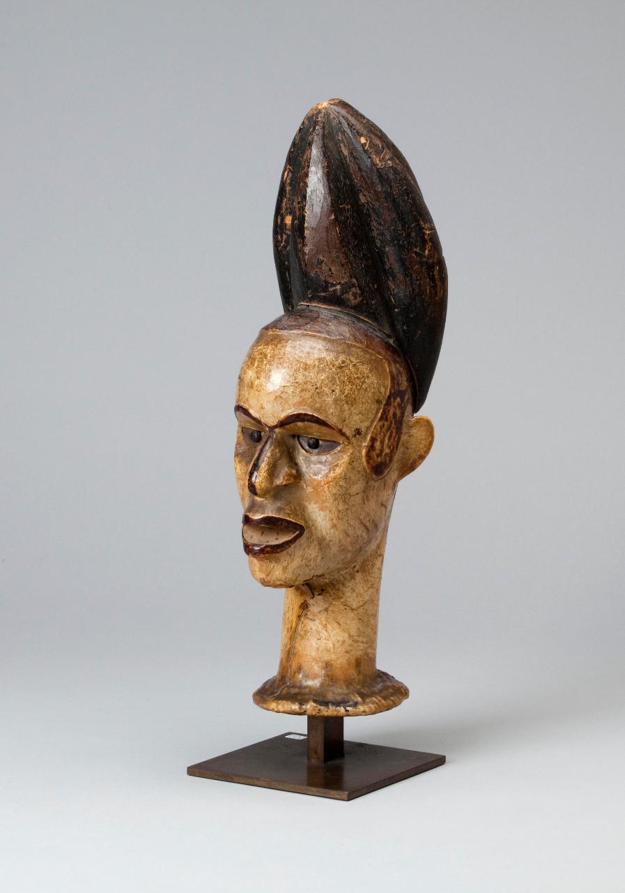 - NOTIZIE STORICO CRITICHE Questa maschera è stata prodotta all'interno della società maschile ngbe. Presso gli Ejagham del Cross River questa società è un'associazione segreta di guerrieri che riveste anche funzioni commerciali e politiche. L'appartenenza di gruppo si costruisce intorno a un insieme di simboli condivisi tra cui le maschere.\nSolitamente le maschere sono ricoperte di pelle di antilope ma si sono anche ritrovate maschere con pelle umana, cosa che fece ipotizzare allo studioso Leo Frobenius che in origine i guerrieri portassero sul capo non una maschera, ma la testa del nemico ucciso. La maschera è stata così interpretata come una forma di appropriazione del potere del morto.