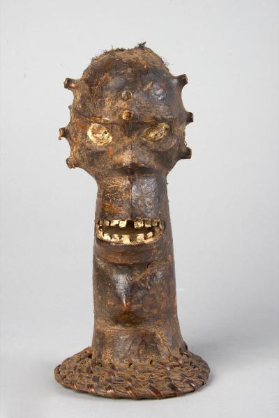 MASCHERA CIMIERO - Testa antropomorfa poggiante su calotta di fibre intrecciate. La scultura lignea rivestita di pelle animale presenta un volto con bocca aperta e denti in mostra, occhi circolari bianchi in grandi cavità orbitali, naso a base triangolare. Tutto intorno alla testa e in mezzo alla fronte piccole protuberanze cilindriche.