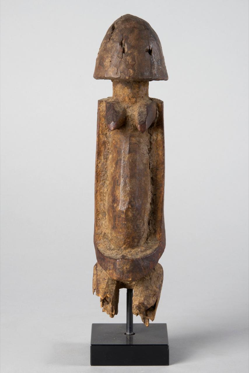 - NOTIZIE STORICO CRITICHE Le statue dogon sono utlizzate in contesti sacrificali e costituiscono di fatto degli altari. La loro funzione (W. E. A. Van Beek, Functions of sculpture in Dogon religion, in African Arts, Los Angeles, vol. 21, no. 4,1988) sarebbe quella di identificare colui che effettua il sacrificio e il problema che vuol risolvere, attraendo l'attenzione degli esseri soprannaturali e rafforzando il contatto con essi. Le statue vengono scolpite dai fabbri (alcuni dei quali sanno anche scolpire il legno) sulla base delle indicazioni tratte da un rito di divinazione che fa uso di conchiglie (cauri) o che interpreta le tracce lasciate dalla volpe sul terreno. Idealmente le sembianze della figura dovrebbero legarsi alla persona che ne farà uso anche se poi in realtà stile e iconografia sono convenzionali e una stessa statua può poi essere usata da più persone. Solo occasionalmente, quando il proprietario originario è deceduto e passa a un figlio, la statua può essere vista come una figura di "antenato". \nQueste statue hanno la funzione di veicolare la preghiera della persona che le possiede. La loro postura può indicare la posizione di preghiera (in ginocchio o con le braccia levate al cielo) oppure lo staus sociale che si vuole raggiungere o ancora una qualche rivelazione avuta in sogno.
