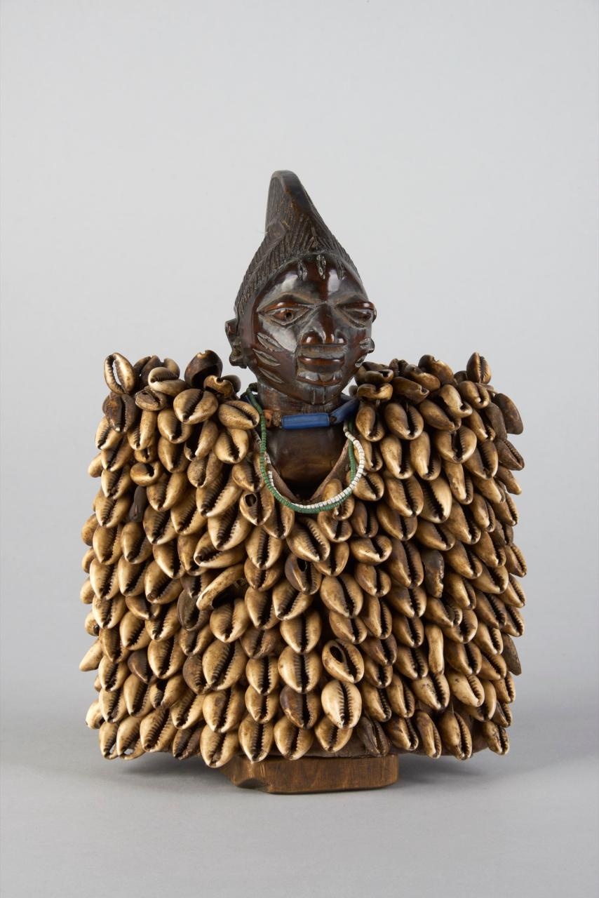 Il corpo è nascosto da un vestito di conchiglie (cauri); al collo collane di perline di vetro. Sul volto incisioni orizzontali (scarificazioni). Acconciatura a cresta.