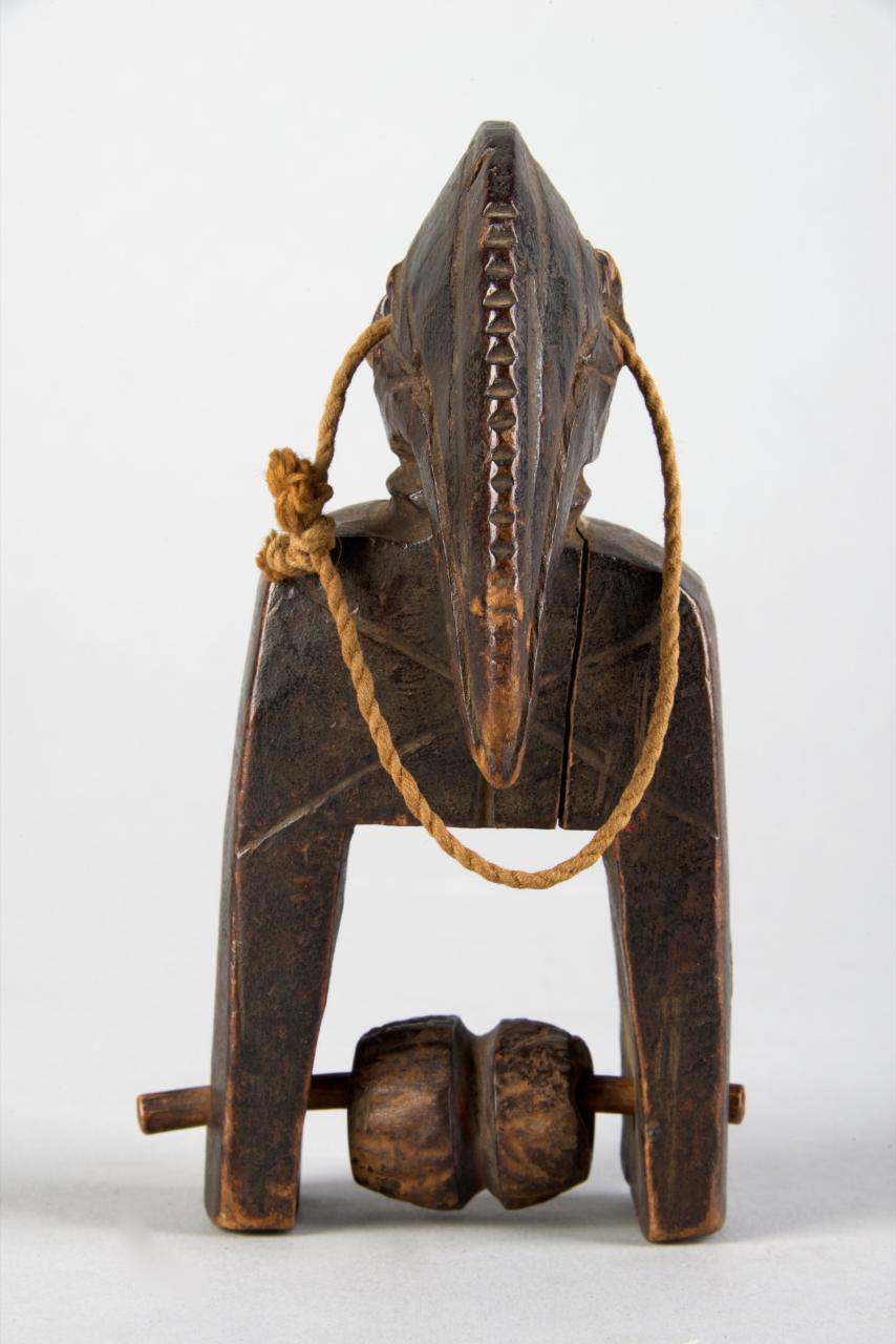 PULEGGIA PER TESSERE - L'elemento funzionale si combina con quello figurativo: la testa consente di fissare la puleggia al telaio legandola per il collo, mentre il rocchetto è tenuto dalle "ali" dell'uccello, i cui elementi salienti sono il becco e la cresta.