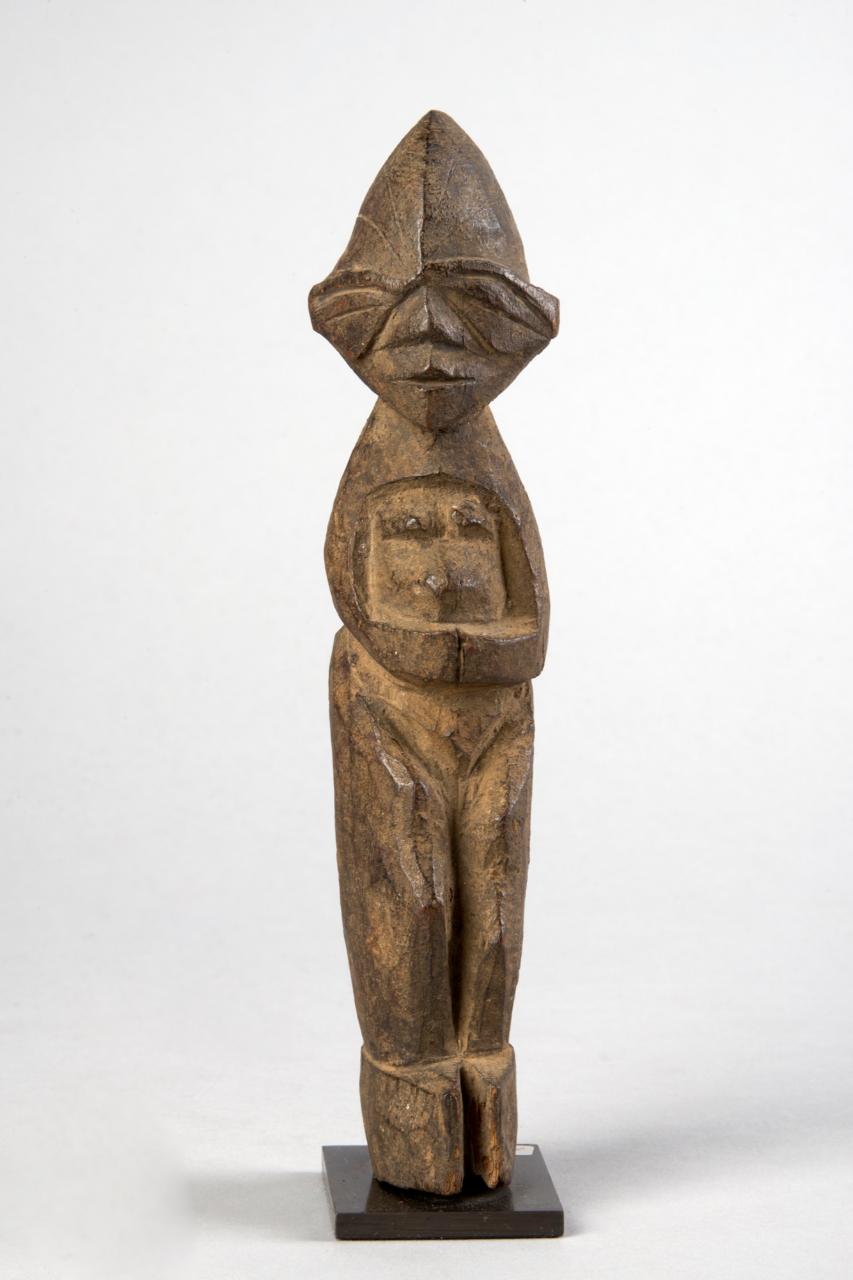 STATUA BOUTHIBA - Figura antropomorfa in posizione eretta, Volto di forma romboidale con linea verticale che lo attraversa dalla nuca al mento. Grandi occhi a chicco di caffé che percorrono tutta la larghezza del volto fino ad arrivare alle orecchie. Spalle di forma conica con braccia aderenti al busto che si piegano per convergere sul ventre. Anche le gambe non sono scolpite separatamente ma delinate all'interno del blocco di legno.