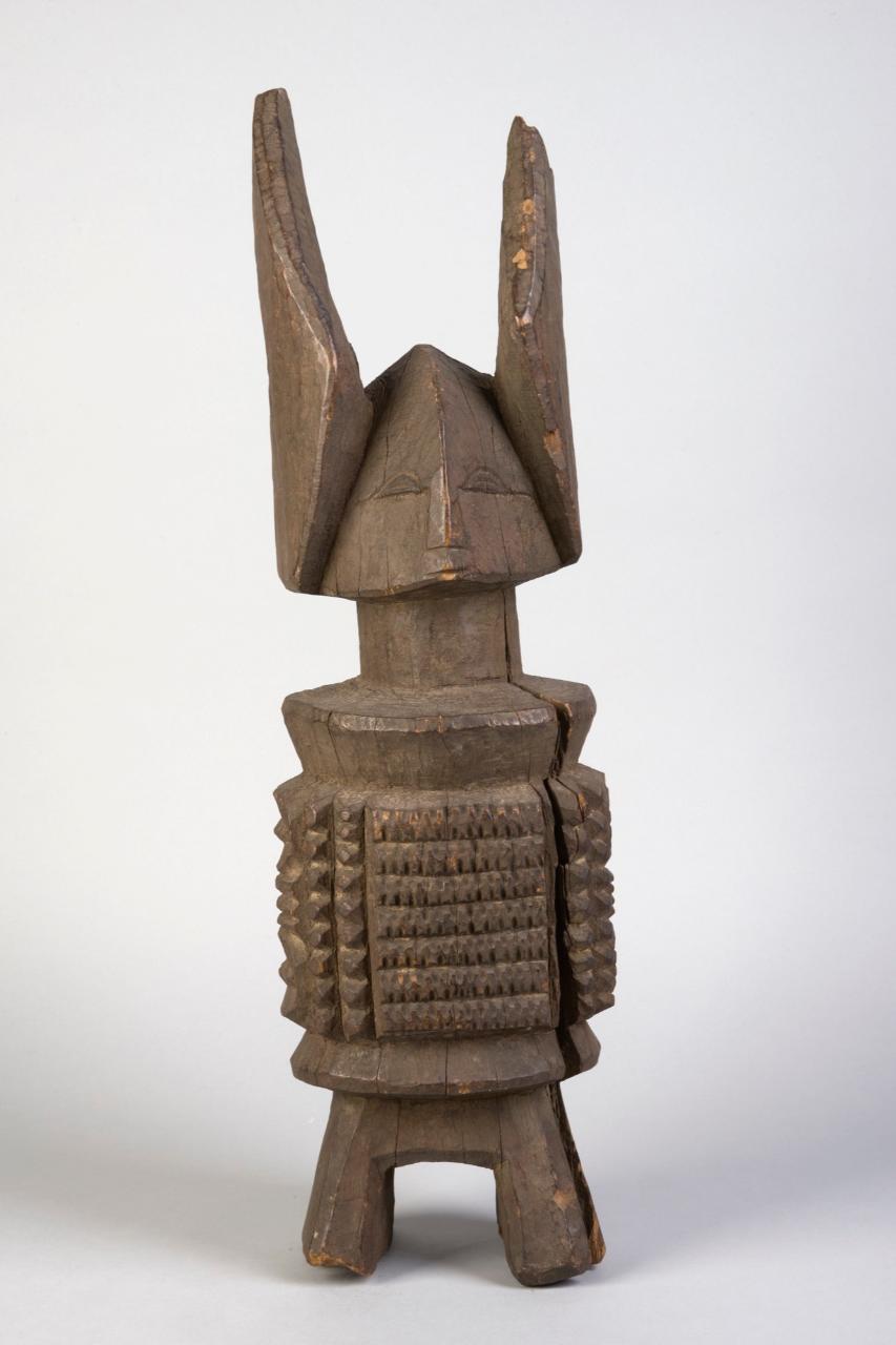 STATUA IKENGA - Figura antropozomorfa costituita da corpo cilindrico densamente inciso, poggiante su quanttro piccoli supporti obliqui. Testa a cresta con lunghe corna laterali. Assente la rappresentazione degli arti superiori.