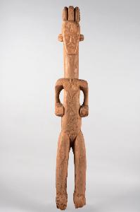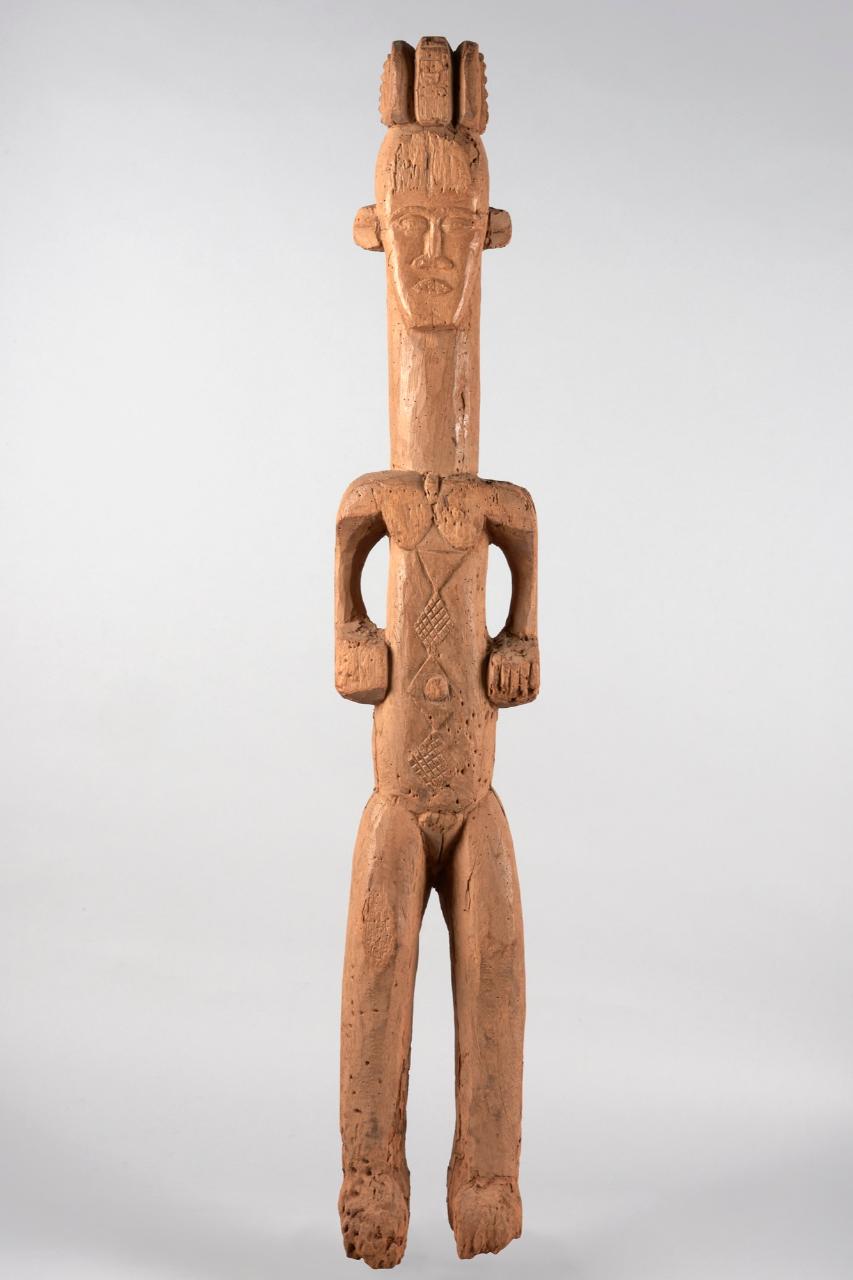 STATUA ALUSI - Figura antropomorfa femminile in posizione eretta. Le braccia scendono discoste dal corpo per poi piegarsi verso il ventre, con mani con i palmi rivolti all'in su. Le forme sono tendenzialmente angolate (in particolare per il mento squadrato) come è tipico dello stile degli Igbo meridionali. L'enfasi cade da un lato sulla testa (allungata e rafforzata dal lungo e robusto collo cilindrico) e dall'altro sull'ombelico e le scarificazioni romboidali del ventre e del torace. \nPatina terrosa rossastra, in particolare sul collo e sulla parte inferiore delle gambe.