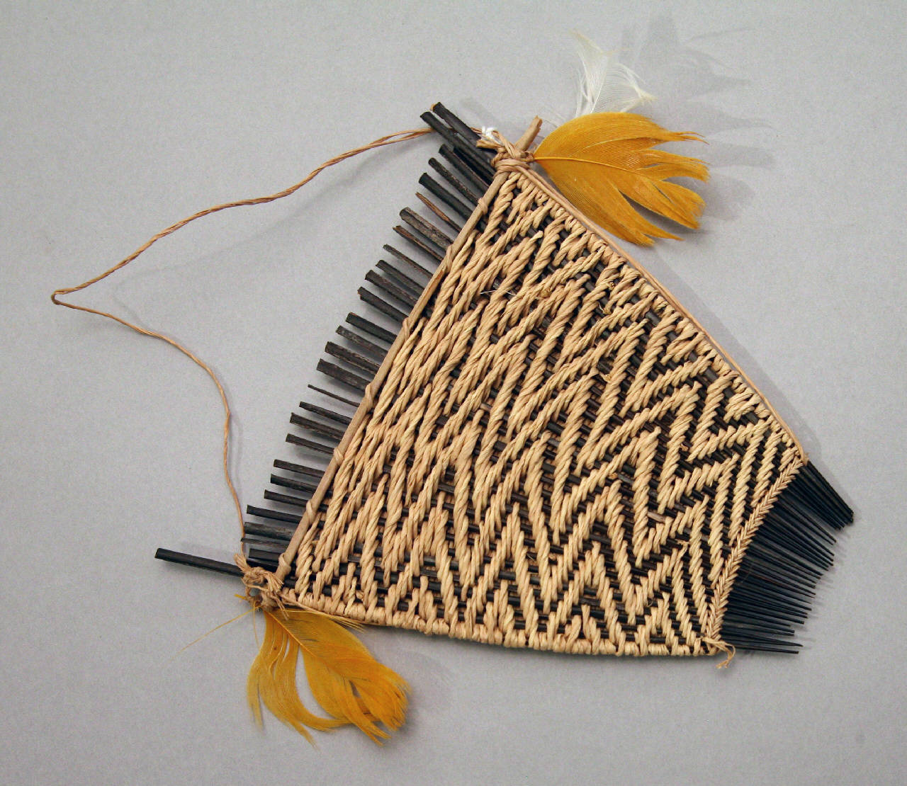Pettine quadrangolare con denti in legno tenuti insieme da filo di cotone intrecciato che forma un disegno a linee spezzate. Piume gialle e bianche sono fissate ai due angoli superiori. Reca cordicella di sospensione in fibra vegetale.