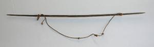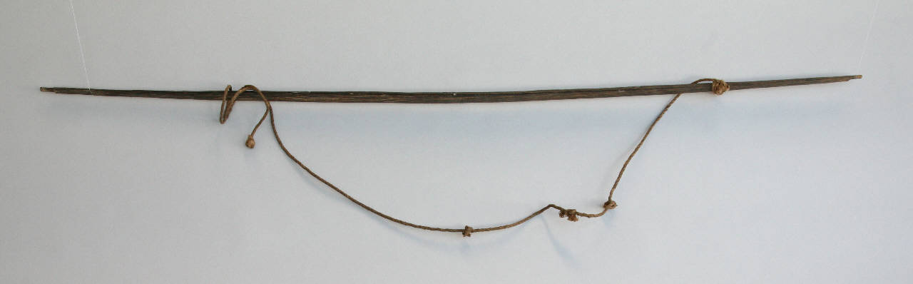 Arco in legno, con corda in fibra vegetale, fissate alle estremità rastremate.