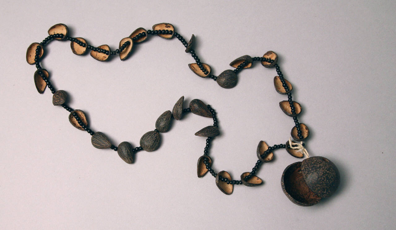 Collana di semi a un solo giro con pendente. I semi sono di tre tipi, due sul giro e uno sul pendente. Sul giro, a quatto o cinque semi piccoli di colore scuro, si alterna un mezzo seme più grande e marrone, mentre il pendente è realizzato con due mezzi semi ancora più grandi sempre marroni.