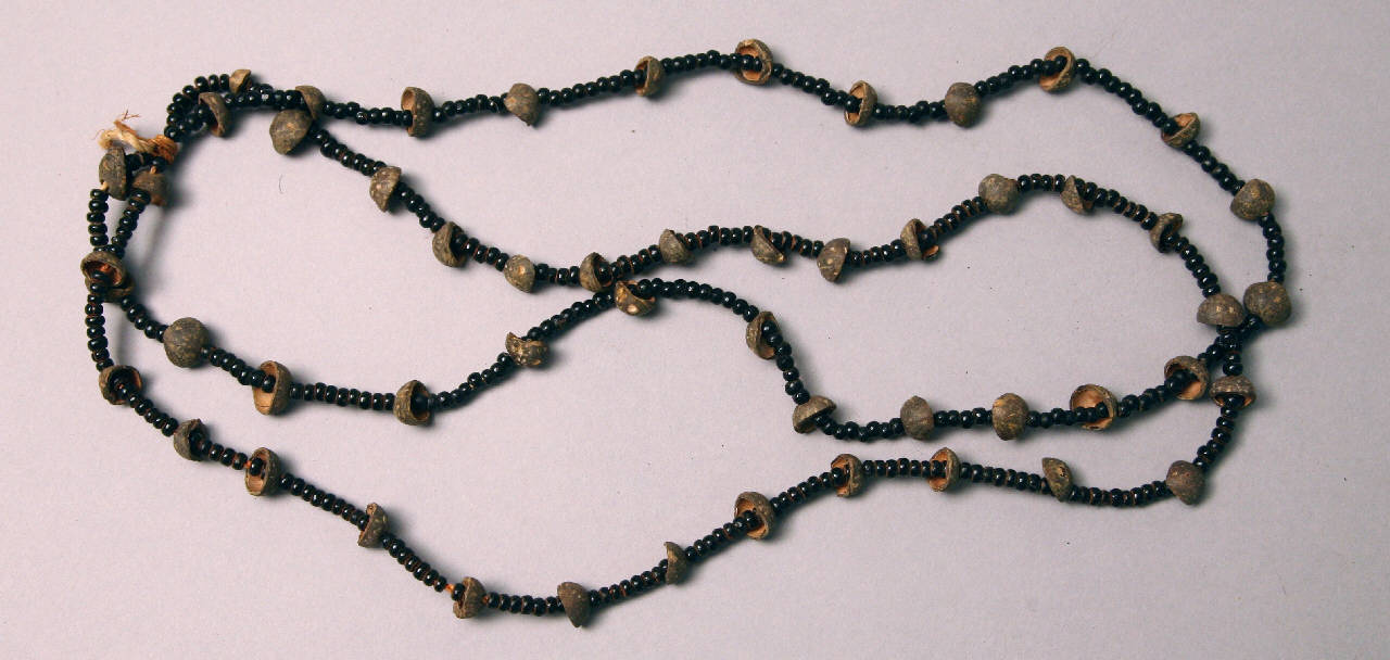 Collana di semi a due giri. Su tutta la lunghezza di entrambi i giri sono infilati semi neri molto piccoli che si alternano a semi più grandi tagliati a metà sempre di colore scuro. L'alternanza è sei-otto piccoli, uno grande.