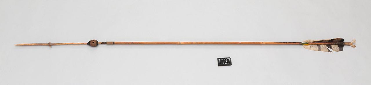 Freccia con asta di bambù, punta in legno e paletta con una penna nera. Alla base della punta è inserito un seme.