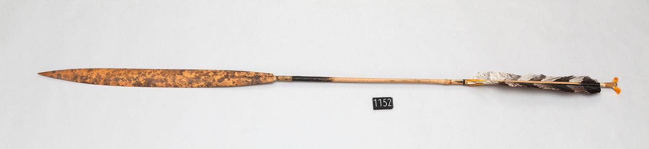 Freccia con asta in canna, punta in canna piatta e paletta con una penna nera e bianca a strisce larghe e delle piume gialle legate alle estremità.
