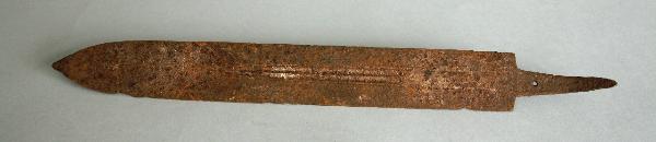 Lama di sezione a ovale schiacciato, larga, a due fili che scorrono paralleli per ttta la lunghezza e convergono a ogiva a metà del debole. Al centro, dal tallone al medio, due scanalature separate da una cresta centrale convergenti a punta acuta. Codolo a forma di triangolo allungato con un foro allla base, piatto, che si espande a rombo al centro dell'impugnatura e termina in un disco per il pomo.