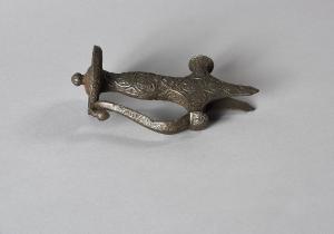 Fornimento rajput. Interamente di ferro, decorato a bassorilievo a girali, formato da elsa, guardia e impugnatura in un pezzo solo; grande pomo a piattello con orlo stondato e decorato a intreccio, saldato alla guardia e sovrastato da cupoletta festonata e bottone. Aggancio di lama che si allunga a freccia e sinuoso paramano con terminazione a bocciolo.