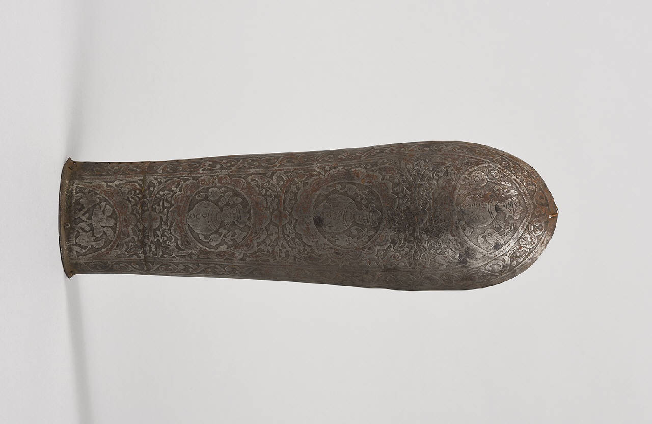 Bracciale di armatura persiano a tre comparti sovrapposti decorato con figure a mezzo busto e intrecci vegetali e floreali.