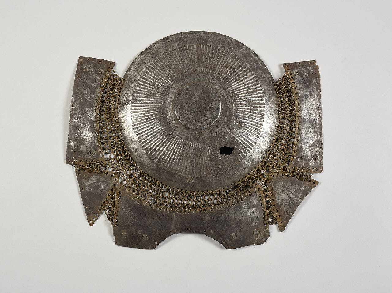 Petto di corazza costituito da specchio centrale liscio con decorazione geometrica a bulino e umboncino centrale. È dotato di due cinghie di cuoio. Marca di fabbrica: asta con mezzaluna.
