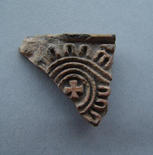 Frammento di timbro. Presenta una decorazione spiraliforme costituita da linee parallele al cui centro si osserva un motivo cruciforme. Il margine esterno della spirale è caratterizzato da una teoria di elementi a U che paiono raffigurare delle piume.