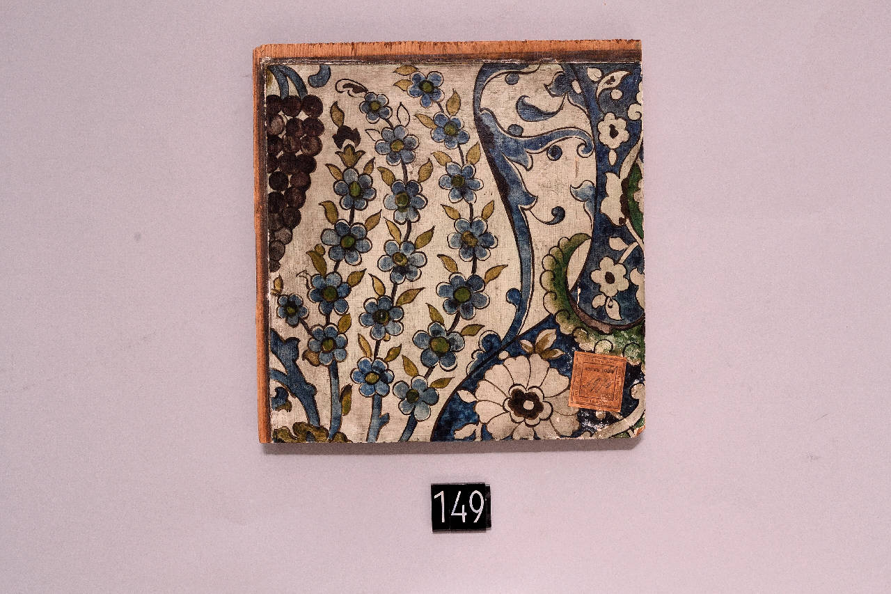 Mattonella quadrata decorata in blu, turchese, verde chiaro, bruno melanzana e bianco . La decorazione consiste nella parte superiore di un vaso decorato con fioriture carnose, foglie e arabeschi. A fianco del vaso sono presenti tre rametti fioriti e la porzione di un grappolo d'uva. Per un certo periodo la mattonella in esame è stata parte di un pannello con le mattonelle inv. ISL 146, ISL 147 e ISL 148 con le quali completava il disegno. \nProfilo in legno.\nProbabile integrazione di un pannello ceramico.