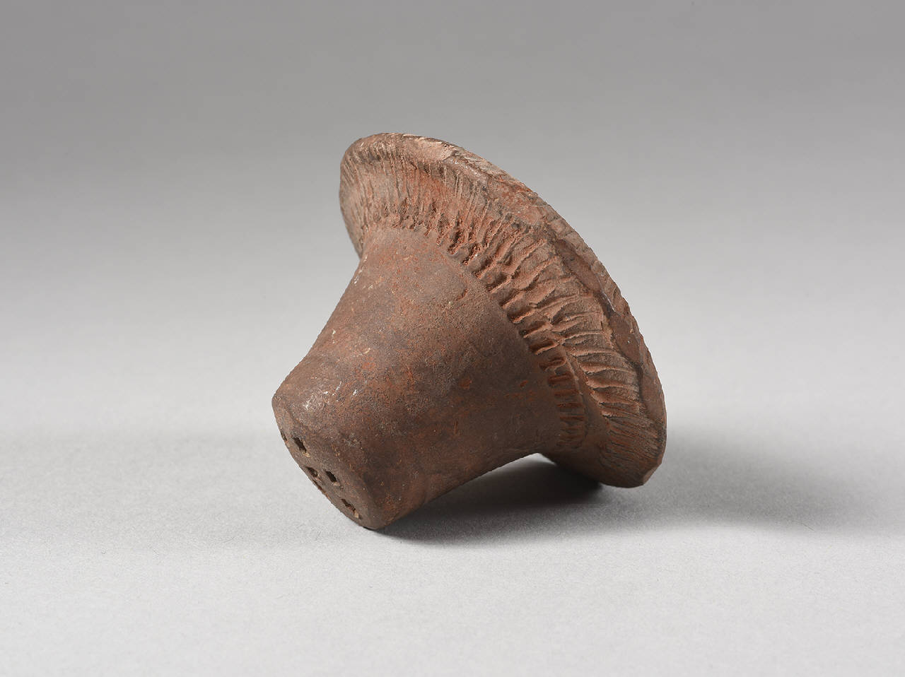 Fornello per pipa in ceramica con base chiusa da una superficie traforata. Decorazioni a rotella sull'orlo superiore.