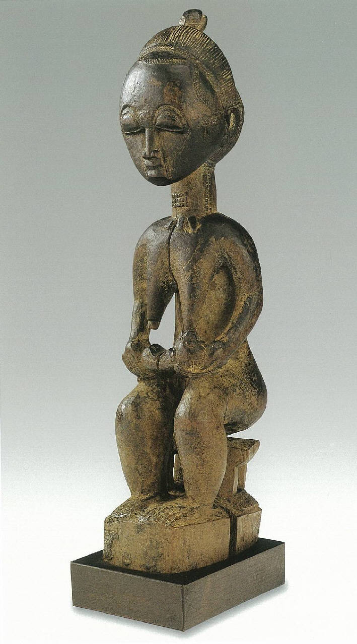 - NOTIZIE STORICO CRITICHE Le statuette baulé rappresentano spiriti della boscaglia (asie usu) o "sposi dell'aldilà" (blolo bian e blolo bla). I Baulé credono che venendo al mondo si abbandoni lo sposo o la sposa che si aveva nell'aldilà. Per evitarne l'ira si fanno scolpire delle figure che corrispondono al modo in cui lo sposo dell'aldilà vuol essere ritratto.