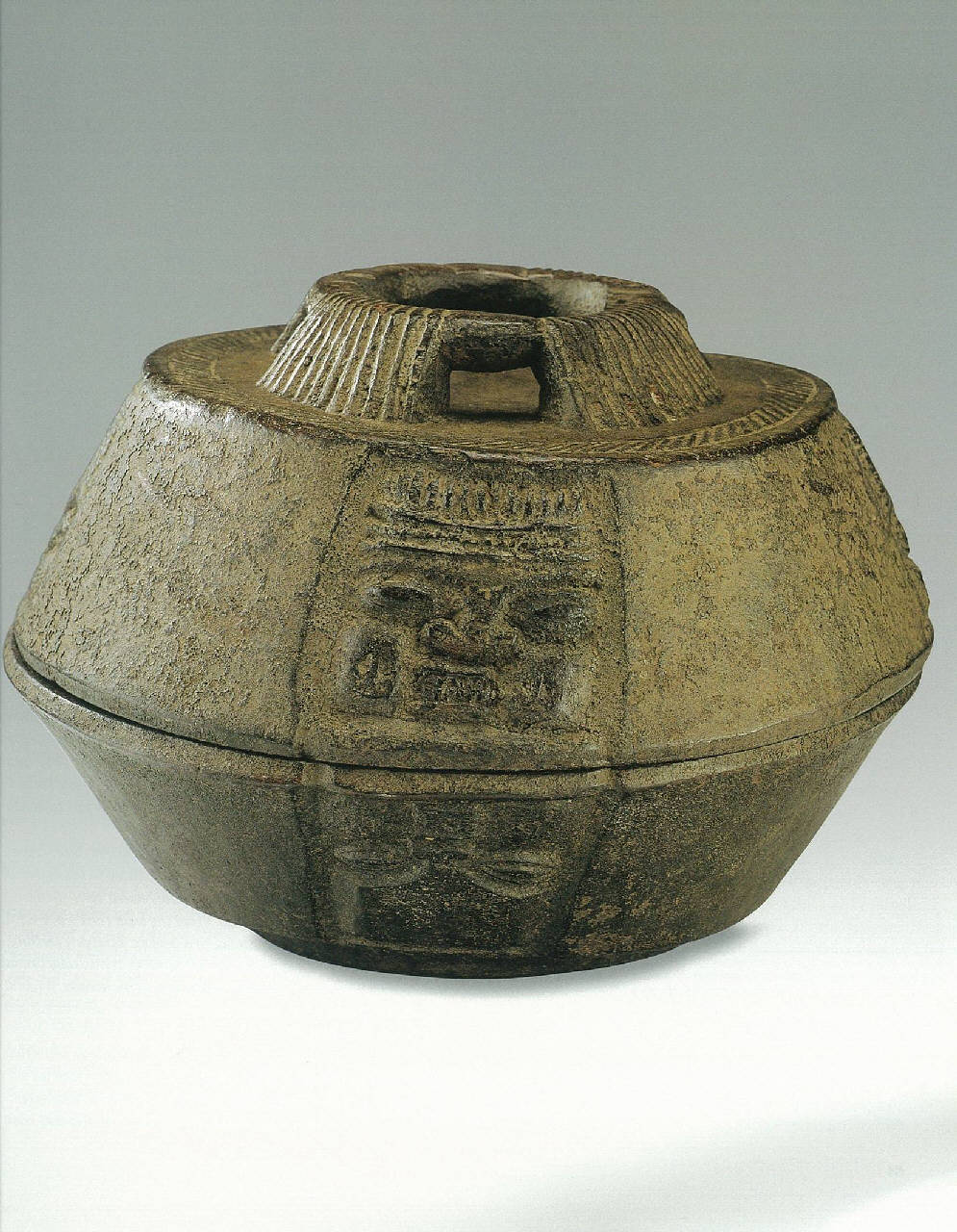 Recipiente per divinazione in forma di scatola tonda. All'esterno è riprodotto a basso rilievo un volto.