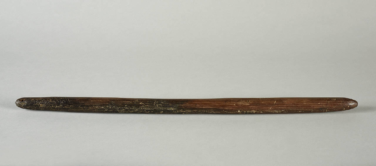 - NOTIZIE STORICO CRITICHE Si tratta probabilmente di un bastone australiano da lancio che Stone (p. 395) indica come bastoni kujerung o kallak, delle tribù Kurnai (l'autore cita Hewitt, p. 265 - fonte non reperita). In un catalogo di Sotheby's (p. 98, n. 125) un bastone molto simile é definito boomerang sudaustraliano "di forma elegante a crescente, e sezione circolare con patina scura e lucida (83 cm. US $ 1,250-1,750)". Le altre fonti mostrano solo disegni di bastoni rigati, senza specificarne le dimensioni. I bastoni australiani erano creati con diversi tipi di legno duro, intagliati in modo rudimentale con strumenti in pietra. Essi potevano anche essere piegati al fuoco per creare i boomerang. Entrambi questi strumenti erano utilizzati per la caccia di animali lenti che potevano essere raggiunti e percossi a morte. Simile al bastone. Nel catalogo n. 44 Raccolta etnografica del museo di Storia Naturale, figurano due clave d'ebano con correggia [nn. inv. 424 e 425] una delle quali "rigata pel lungo", equivalente al n. 37 della donazione Sig. Prospero Mosé Loria 1865.Sappiamo anche di una donazione Cesare Bossi (1885?) di 36 armi australiane. \nRiferimenti: \nSTONE, George Cameron, A glossary of the construction, decoration and use of arms and armours; in all countries and in all times, New York, Jack Brussell Publisher, Noble offset printers inc., 1961.\nBLAIR, Claude (a cura di), Enciclopedia ragionata delle armi, Milano, Mondadori, 1979.\nAA.VV., Sotheby's, Aboriginal Art, Melbourne, Sotheby's Australia PTY, LTD, 2002. AU0659, 24 June.\nAborigines Tools and Weapons, www.att.virtualclassroom.org/vc97/VC_07/A_TRART.HTM\nPrimitive Technology Artifact Sales, www.flight-toys.com/artifacts.htm