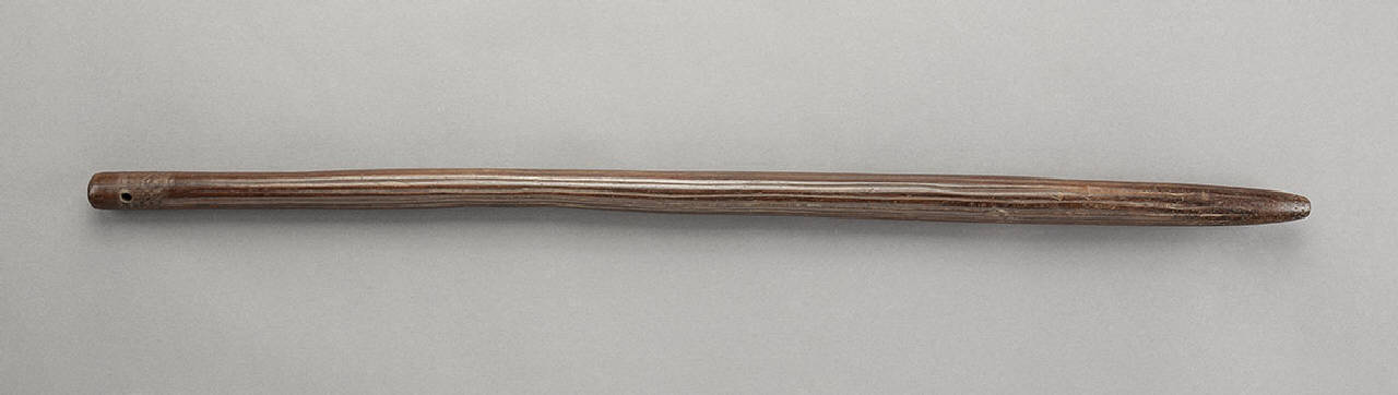 Bastone in legno con grosse rigature nel senso della lunghezza. Puntinatura circolare su due file parallele in prossimità della punta rastremata; l'estremità opposta è forata e decorata con segni di martellature.