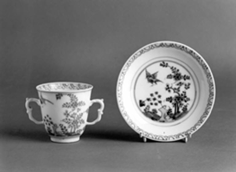 Il piattino presenta linee concentriche che delimitano un soggetto di gusto orientale e che si ripetono sul verso, lungo il bordo e intorno alla marca. La tesa è ornata con un motivo a scaglie.