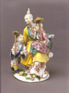 Gruppo su base bianca con fiori applicati policromi, costituito da una donna orientale seduta con due bambini, uno sulle ginocchia, l'altro in piedi al suo fianco, entrambi con ombrellino. La donna indossa una veste gialla, con risvolti verdi alle maniche e al collo, che lascia intravvedere la camicia e la sottogonna bianche, con decoro policrono "Indianische Blumen".\nI Bambini indossano rispettivamente veste rosa intenso con fiorellini, fascia in vita, pantaloni verdi, e scarpe rosso-ferro e veste bianca con decori rosso-ferro, maniche e collo con risvolto blu, scarpe blu e pantaloni gialli.