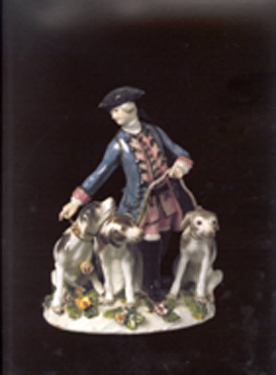 Gruppo su base bianca con fiori e foglie policromi applicati, che rappresenta un uomo che tiene al guinzaglio tre cani da caccia. Il cavaliere indossa un abito da caccia rosa e blu con alti stivali e tricorno nero. I cani sono bianchi a macchie grigie.\nSotto la base è presente un foro regolare accanto a un sostegno curvo, allungato.