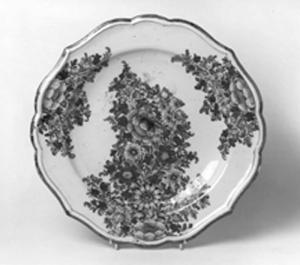 Grande piatto dalla tipica forma milanese dal profilo mistilineo senza anello d'appoggio, mostra il consueto biscotto in terra chiara rivestito di smalto ordinario, povero di stagno , con diffuse piccole imperfezioni: punte di spillo e inaderenze. Il bordo è listato in bruno con un filetto in blu. E' dipinto in policromia a gran fuoco con eccezione dei rossi : la tavolozza è dominata dal verde marcio degli elementi fogliati stesi a brevi tratti; l'ornato è profilato in blu e sostenuto in blu da tocchi gialli a gran fuoco mentre il rosso-ferro è steso a velature, protetto da rapidi tocchi di vetrina, e consolidato a temperatura inferiore.